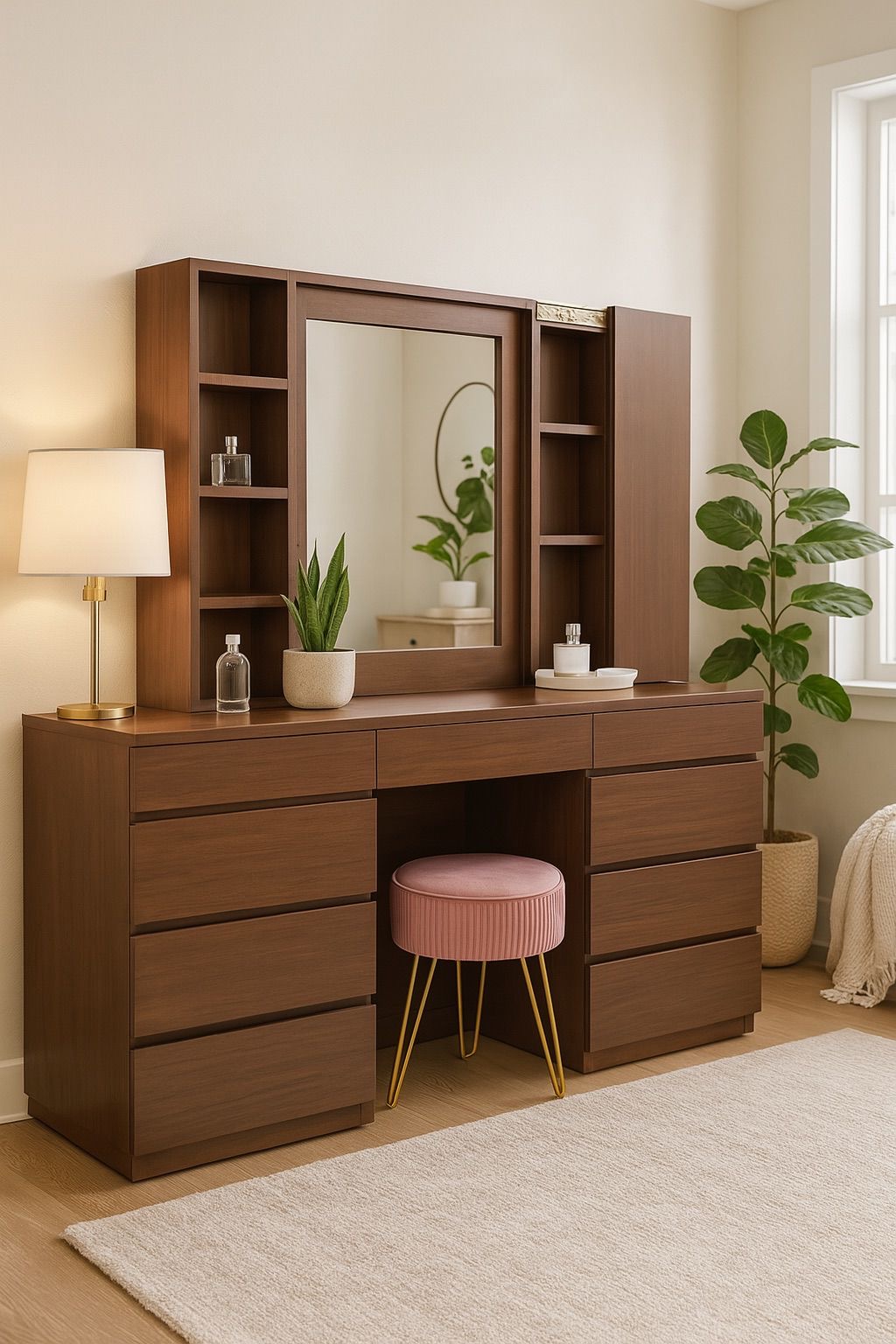 Tocador con banca minimalista corte 45 nogal claro